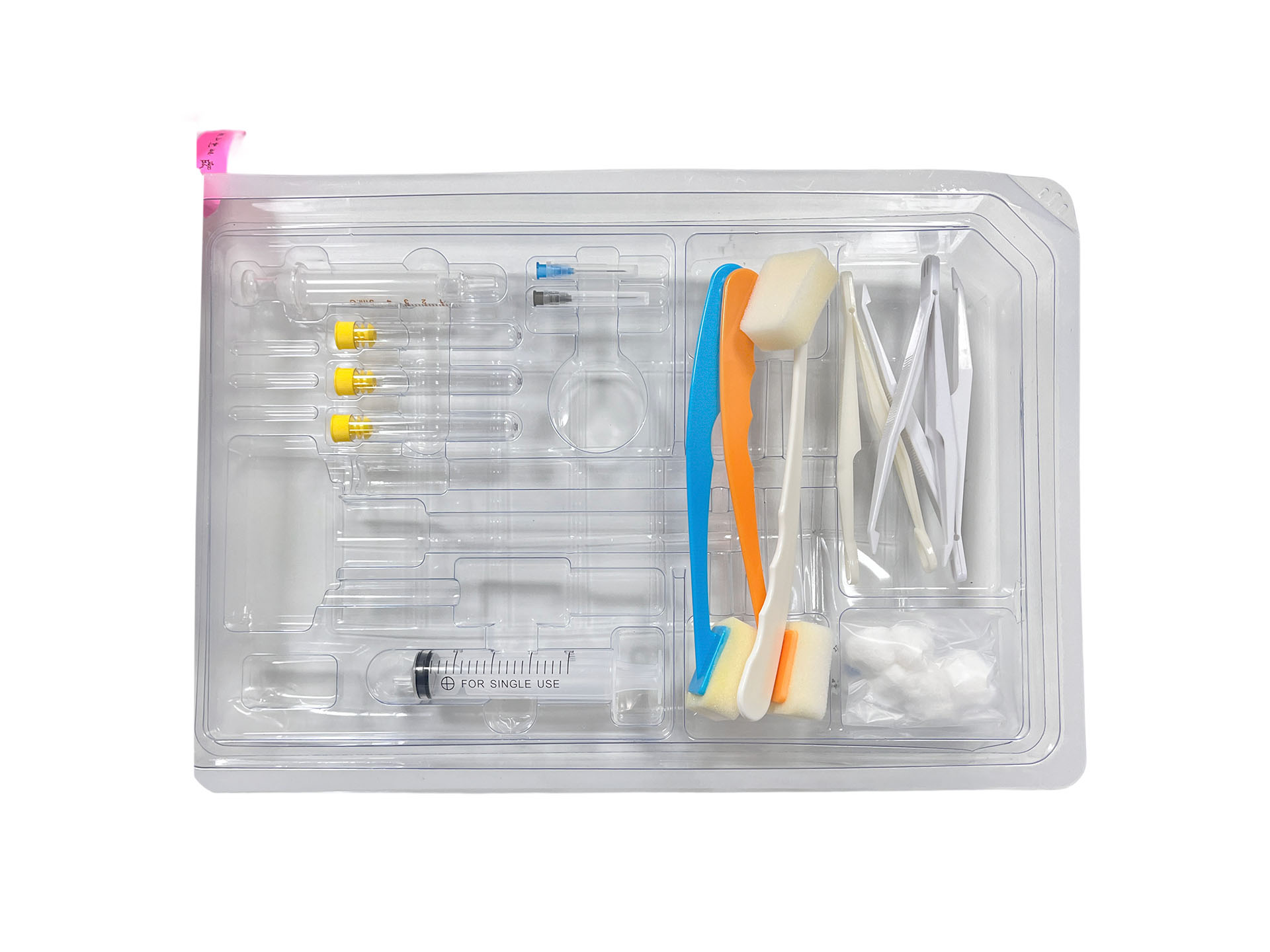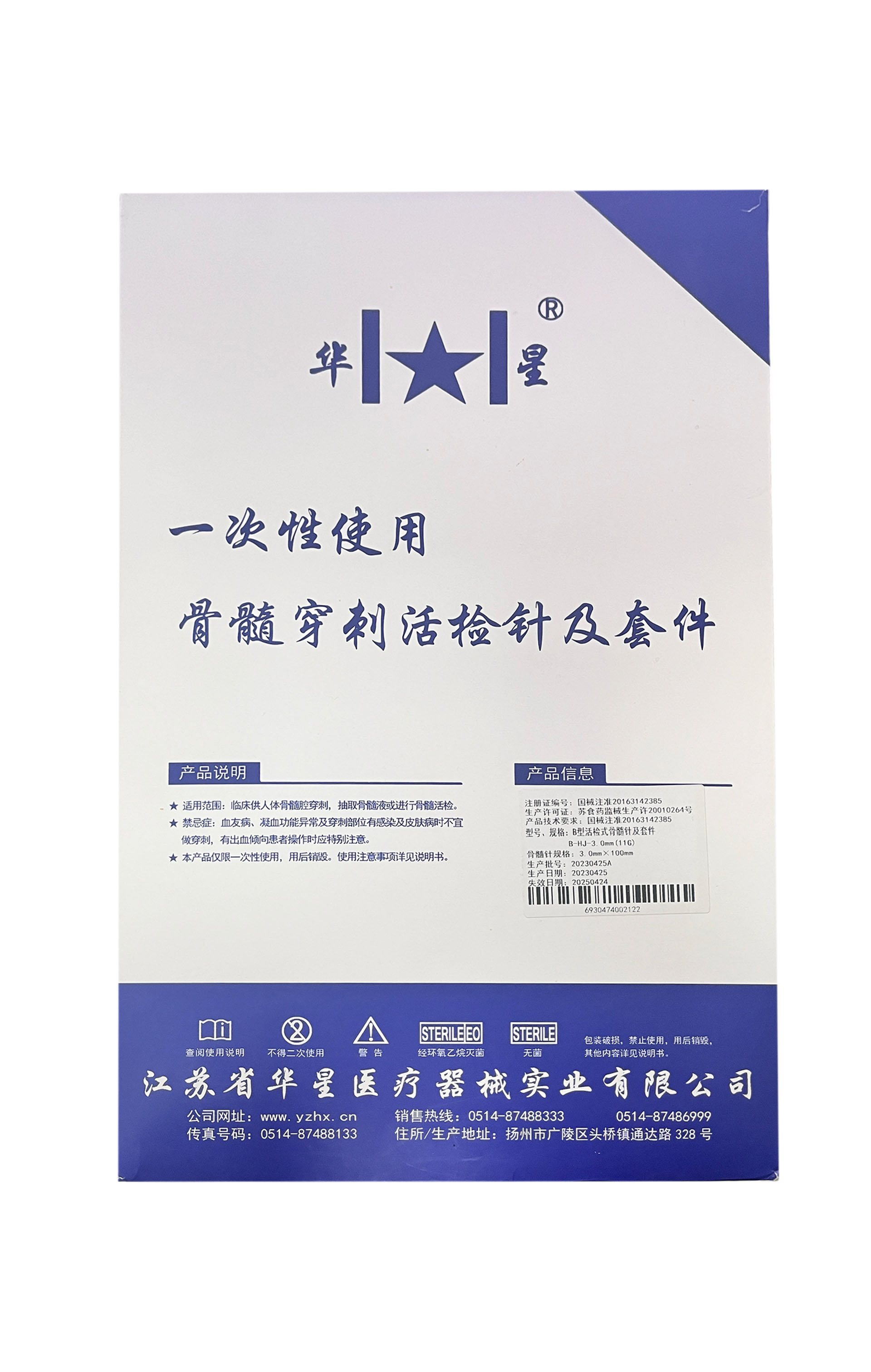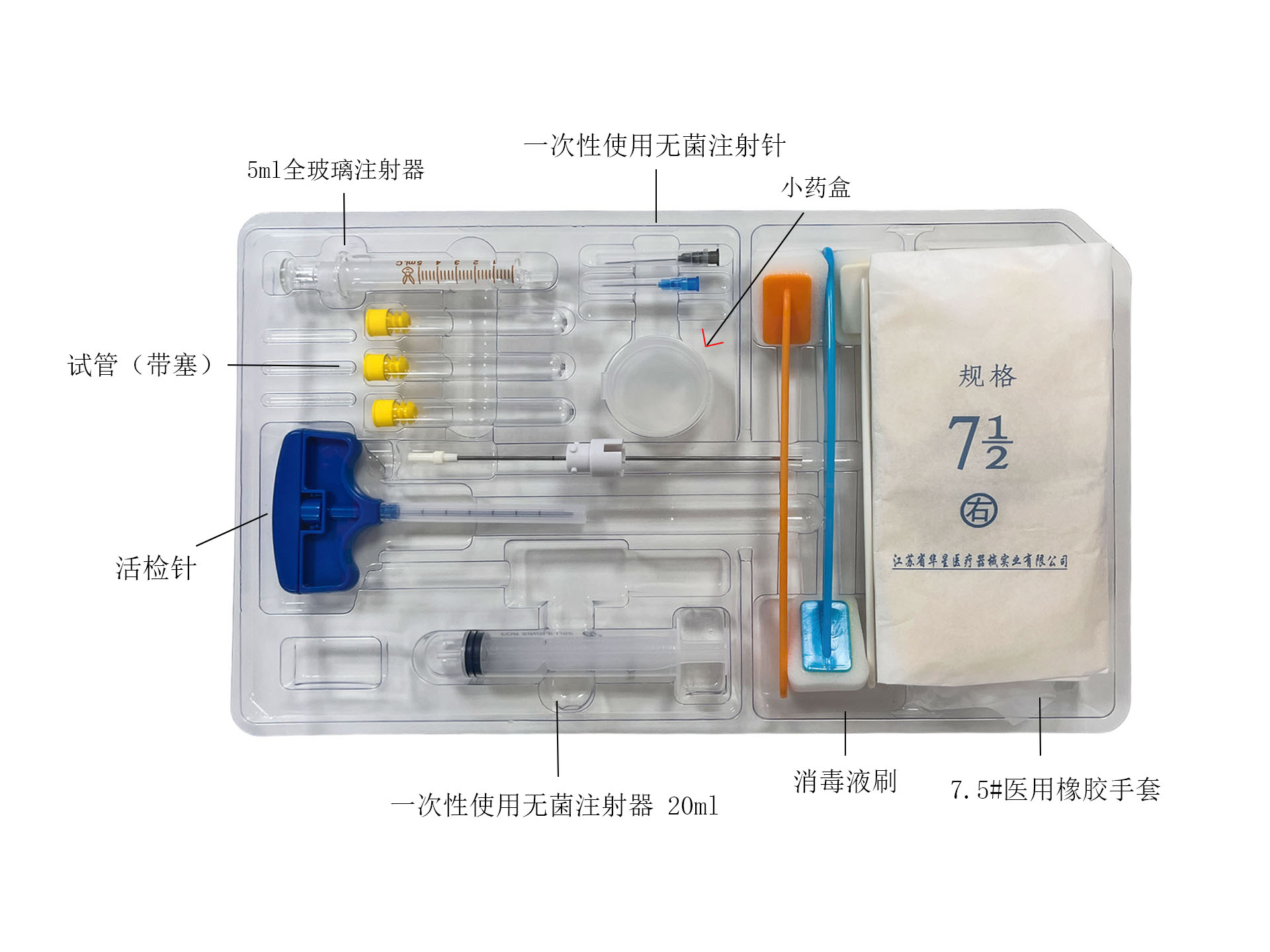一次性使用骨髓穿刺活檢針及套件基本配置由一次性使用骨髓穿刺針-抽吸式、一次性使用骨髓穿刺針-活檢式、一次性使用骨髓穿刺針-小兒式、取樣管、接柱組成。選用配置由橡膠醫(yī)用手套、全玻璃注射器、一次性使用無(wú)菌注射器、一次性使用無(wú)菌注射針、塑料鑷子、試管(帶塞)、脫脂紗布疊片、棉球、膠帶/膠貼、載玻片、通針、手術(shù)巾(洞巾)、敷料巾(包布)、消毒液刷、換藥盒、器械盤(pán)組成。產(chǎn)品按不同的配置分為A型、B型、C型、D型,按穿刺針的型式分為抽吸式、活檢式、小兒式。產(chǎn)品經(jīng)環(huán)氧乙烷滅菌,為一次性使用。