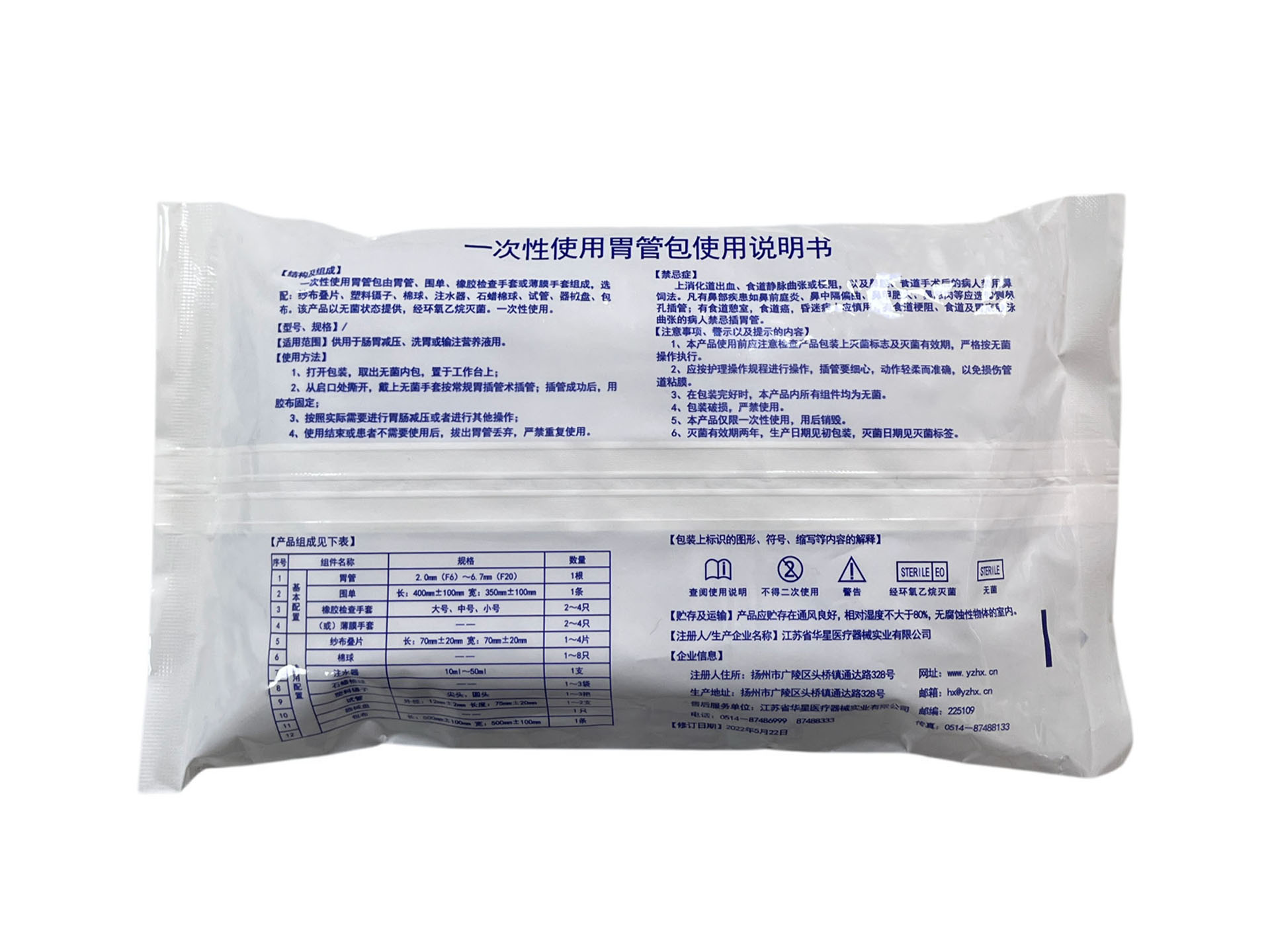 一次性使用胃管包由胃管、圍單、橡膠檢查手套或薄膜手套組成,選配:紗布疊片、塑料鑷子、棉球、注水器、石蠟棉球、試管、器械盤、包布。產(chǎn)品經(jīng)環(huán)氧乙烷滅菌,應(yīng)無菌。