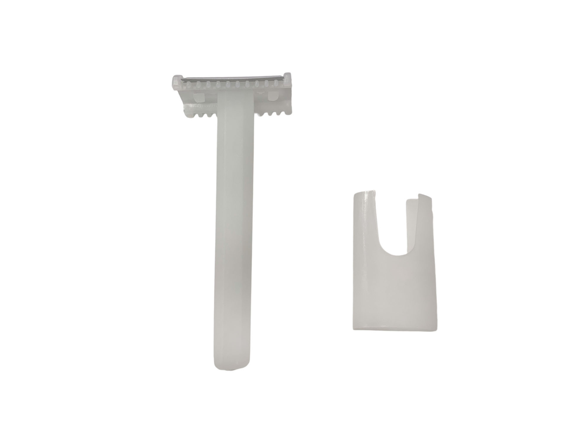 一次性使用備皮刀由護(hù)蓋、蓋片、刀片、刀柄組成。備皮刀的刀片采用符合QB/T 1105-1991的雙面刀片制成,刀柄、護(hù)蓋、蓋片采用聚丙烯材料制成。產(chǎn)品經(jīng)環(huán)氧乙烷滅菌,無菌。